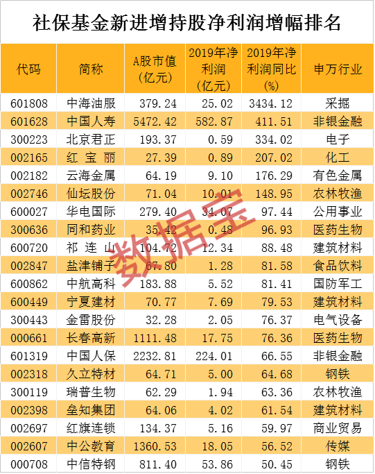 从业绩数据来看,社保基金新进增持股中不乏高增长标的。数据显示,21股去年净利润同比增长50%以上。净利润增幅最高的是,其去年实现盈利25.02亿元,同比增长34.34倍。公司表示,去年国际油气价格中低位徘徊,但全球上游勘探开发投资持续复苏;国内实施七年行动方案,市场需求随着增储上产的推进、勘探开发投入的加大而明显提升。中国人寿、北京君正、红宝丽、云海金属、仙坛股份等净利润也实现了翻倍增长。