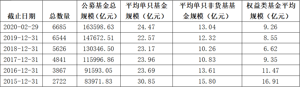 表1:近年来公募基金平均规模呈现整体下降趋势